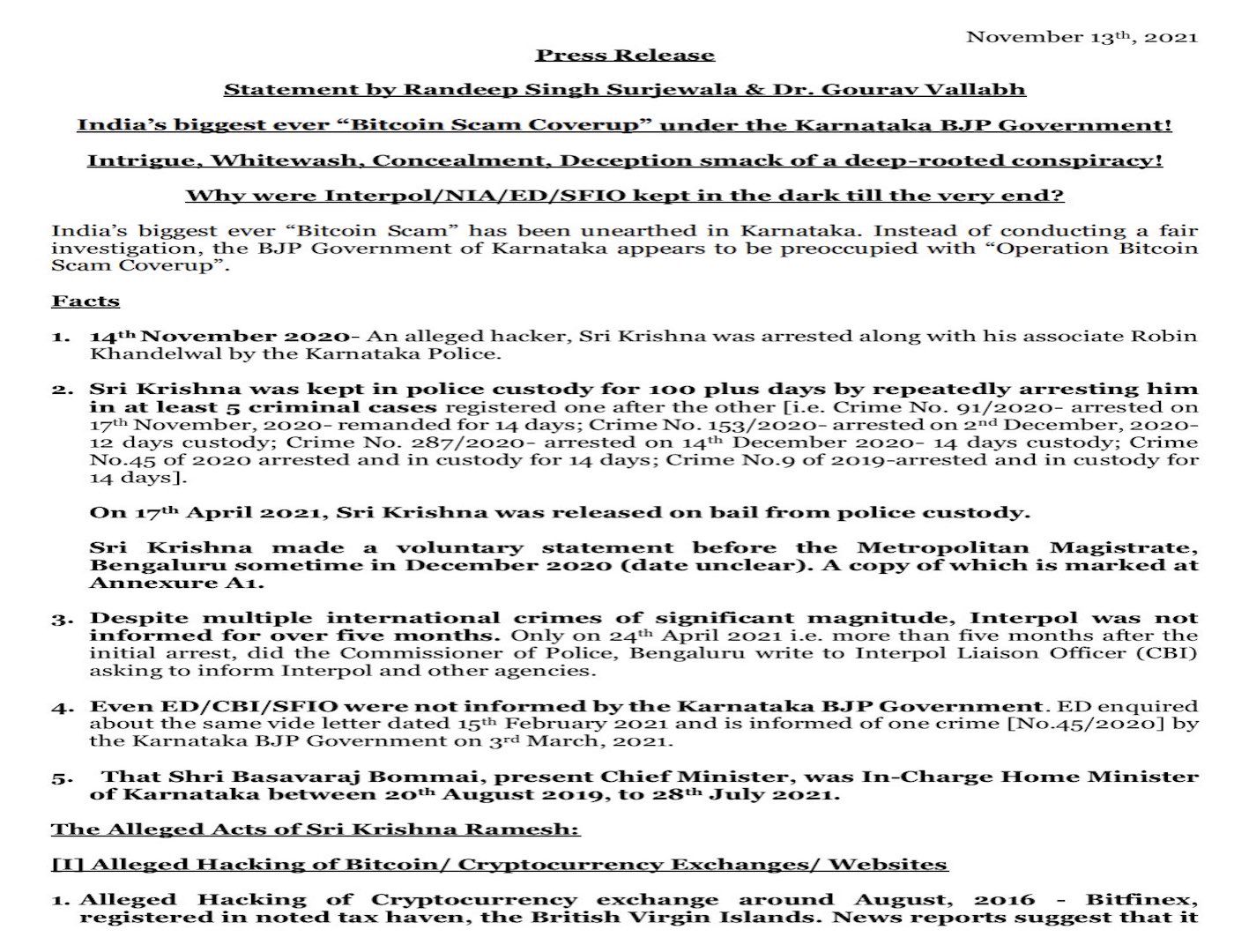 “This is a case of intrigue, whitewash, concealment, and deception smack of a deep-rooted conspiracy. It is India’s biggest-ever ‘Bitcoin Scam Cover Up’ under the Karnataka BJP government,” Surjewala said in a press conference. “Instead of conducting a fair investigation, the BJP Government of Karnataka appears to be preoccupied with a cover-up.”